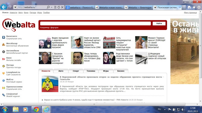 Была проблемка - Webalta. После каких-то установок программ или скачивания с интернета (история об этом умалчивает) появилась навязчивая поисковая система Webalta, которая сначала заменила домашнюю (стартовую) страницу во всех имеющихся у меня браузерах (IE,Mozilla Firefox, Opera, Google Chrome) а затем, после переназначения стартовой страницы, тупо стартовала совместно с ней (т.е. открывались сразу две вкладки - стартовая и Webalta.)