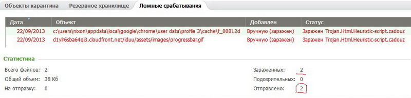 Здравствуйте, но своем ноуте после обновления антивира, давно не включал его, обнаружилось два файла как вирус, но на всякий случай решил пометить как ложное срабатывание. На скриншоте видно, что они уже к вам отправлены. Что скажете о них?