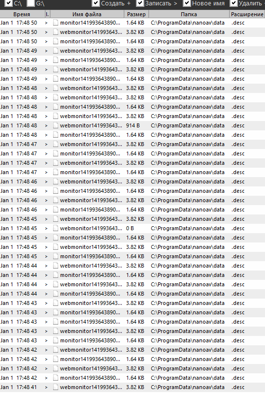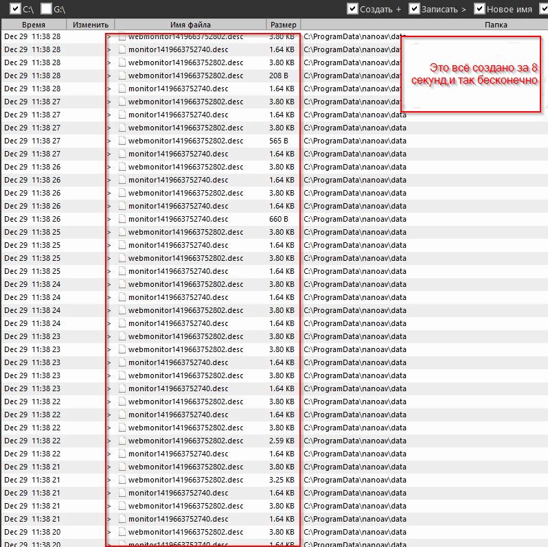 Сделал небольшой мультфильм в формате gif для наглядности происходящего(попробую добавить,посмотрим что получилось),хочу пояснить что файлы не создаются в папке C:\ProgramData\nanoav\data а идёт постоянная запись в файлы monitor1419663752740.desc и webmonitor1419663752802.desc то есть количество файлов в данной папке не приростает,а лишь временами изменяется размер этих двух файлов например с 2КБ на 4Кб(примерно) и обратно к значению по умолчанию для каждого файла.