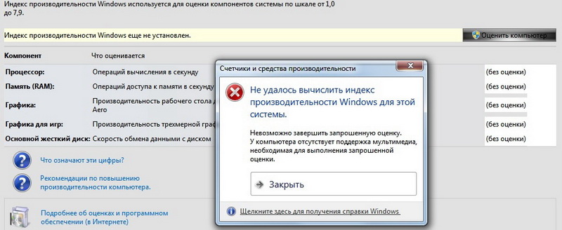 Есть проблема. Стоит Windows 7 x64. Оценка производительности системы получить не удается, выходит ошибка, связанная с мультимедией. В журнале антивируса есть множество заблокированных файлов от Windows Media Plaer 13...подробные скришоты выложу чуть позже..прошу помочь с этой проблемой. Спасибо.