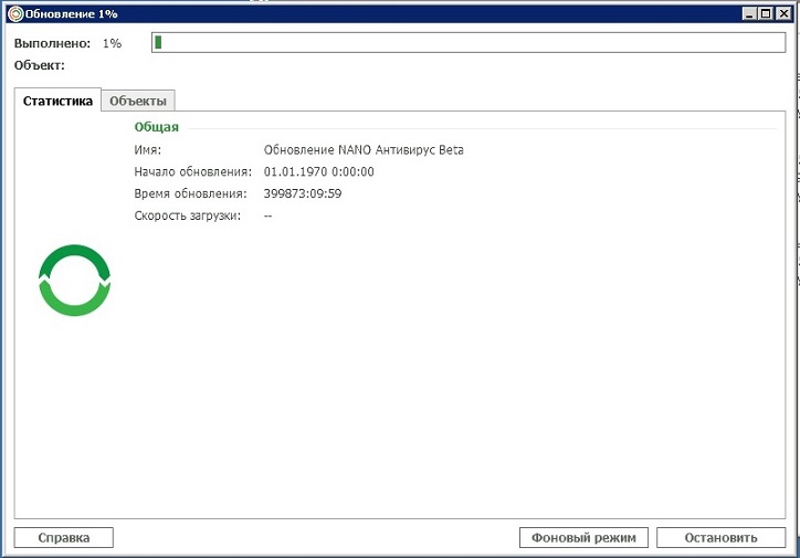 При нажатии на обновить, повторялась история изложенная ранее. После того, как закрыл антивирус без перезагрузки сервера и снова открыл и нажал обновить антивирусные базы, т.к. они не обновляются (судя по данным, которые отображает антивирус), мне антивирус выдал следующие результаты (все видно на скриншоте), при этом процесс тупо висел на 1% и не чего не обновлялось, при нажатии на кнопку остановить нечего не происходило.