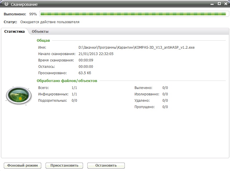 Комментарий к файлу: Затем восстановил его в папку отдельную, нажал проверить на вирусы Nano, показал вот что "Статус: Ожидается действие пользователя" А на всем рабочем столе нигде всплывающее окошко не вышло с выбором действий, нажимал вкладку "Объекты" а там нету выбора действий