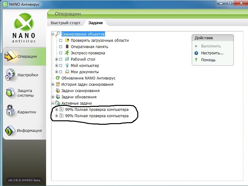 ОС Windows 7 x64, при полной проверке компьютера, подзовис весь процесс, после закрытия антивируса и открытия за нова в активных задачах обнаружил, что полная проверка компьютера выполняется аж 2 раза, 1 задачу закрыл, а вот 2 процесс закрылся через мин 5 хотя иконка в трее отображает мол он чтот делает )))