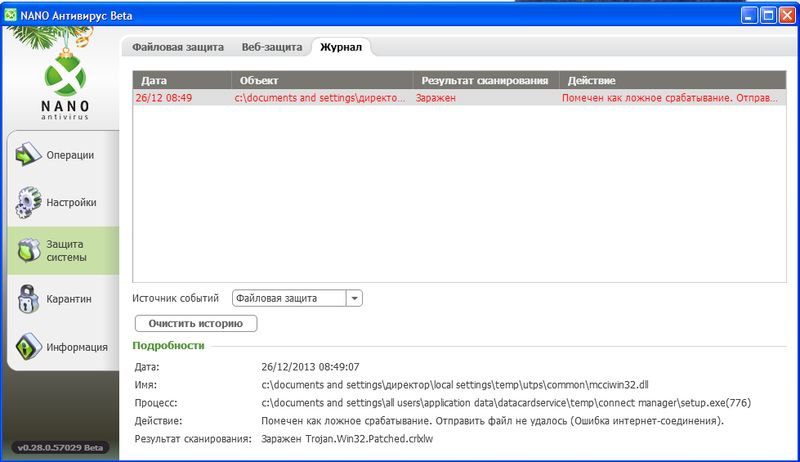 iehegrby, в другой ветке нашего форума вы упомянули, что на вашем ПК имеется сторонний антивирус — Dr.Web. Возможно, он был некорректно удален. В любом случае, чтобы разобраться в проблеме, вышлите, пожалуйста, логи работы NANO Антивирус в службу поддержки. Для отправки логов воспользуйтесь соответствующим ярлыком в "Пуск\Все программы\NANO Антивирус" (не забудьте добавить краткое описание проблемы и ваш e-mail для обратной связи).