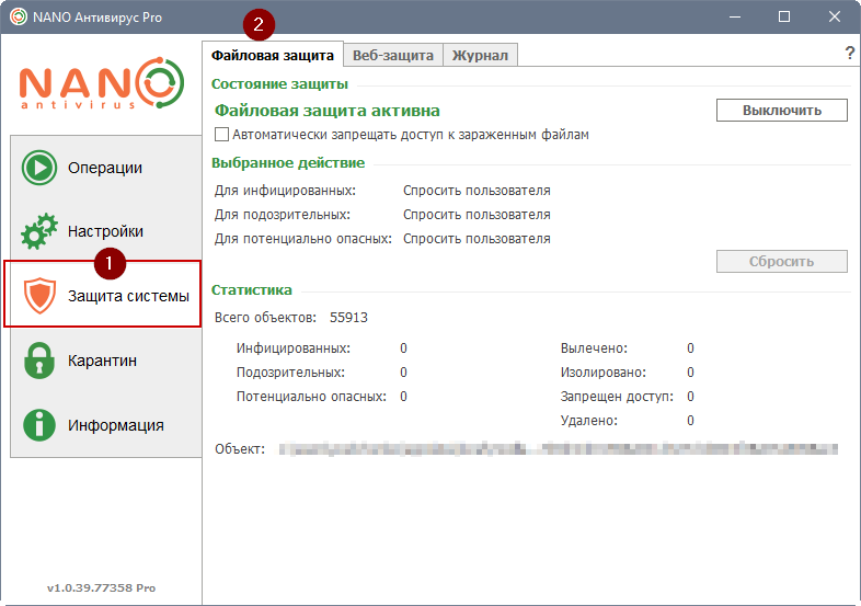 В главном окне антивируса откройте вкладку "Защита системы\Файловая защита", на этой вкладке нажмите кнопку "Выключить" (см. поясняющий скриншот во вложении)