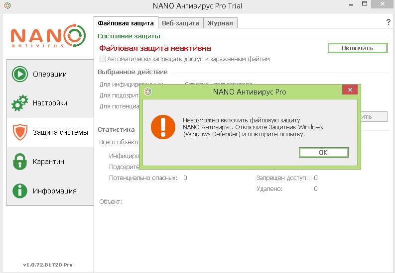 Если у Вас установлена не серверная ОС, такое поведение считается неверным. В этом случае потребуются дополнительные исследования. Пожалуйста, отправьте логи работы NANO Антивируса в службу поддержки. Для отправки логов воспользуйтесь ярлыком в "Пуск -> Все программы -> NANO Антивирус -> Сообщить о проблеме в службу поддержки". В описании укажите Вашу проблему либо ссылку на сообщение на форуме.